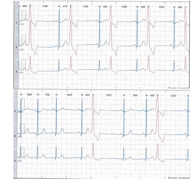 A paciente é uma mulher de 40 anos que pratica corrida de rua quatro vezes na semana há cerca de 10 anos. Ela refere palpitações raras, sem síncope ou pré-síncope. ECG sem alterações. Apresenta o seguinte traçado em holter.