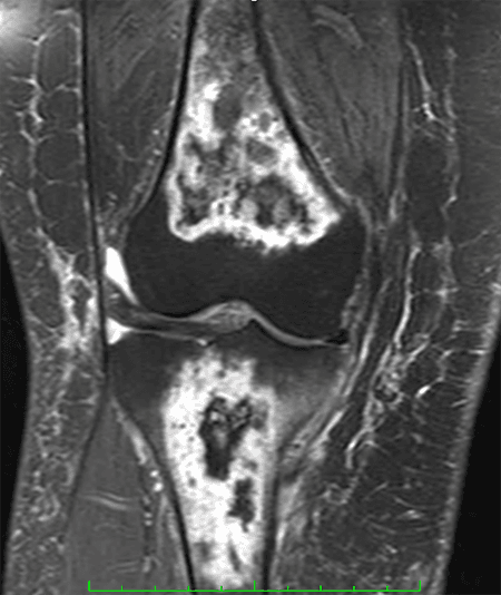 Paciente do sexo feminino, com 53 anos e quadro de dor crônica no joelho direito, principalmente na face anterior e medial. Ela refere piora da dor há uma semana, apresentando dificuldade na deambulação. Nega trauma e relata ter se submetido à cirurgia no tornozelo direito. Refere tratamento para asma brônquica com corticoide há anos.