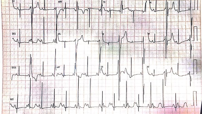 Um homem de 82 anos com queixa de fadiga e pré-síncope, internado com bloqueio atrioventricular (AV) avançado após ter implantado marcapasso definitivo no dia anterior, apresenta o seguinte eletrocardiograma (ECG):