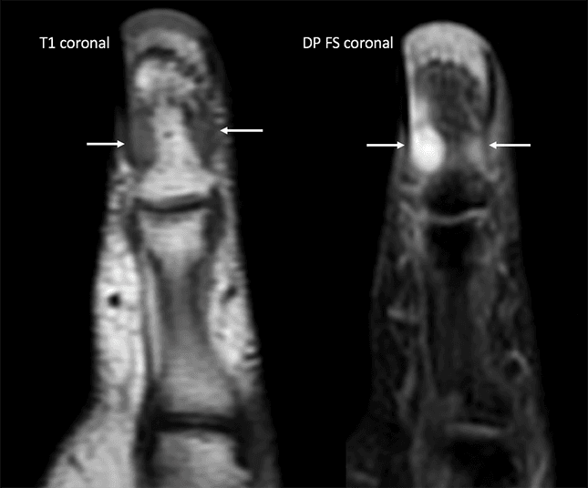 Ressonância magnética (RM) do primeiro quirodáctilo em plano coronal, sequências ponderadas em T1 e densidade protônica com saturação de gordura.