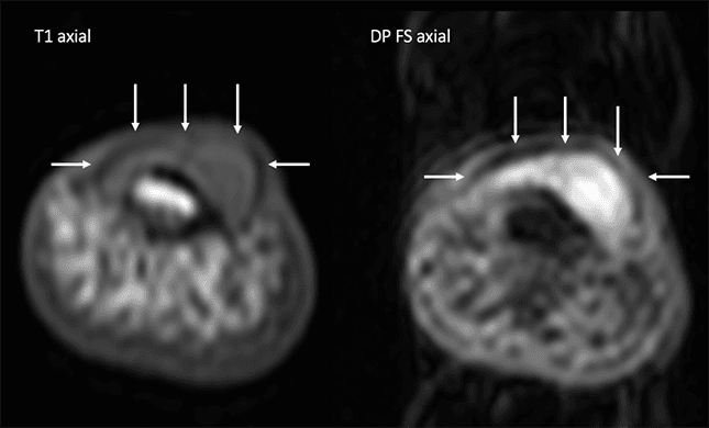 RM do primeiro quirodáctilo em plano axial, sequências ponderadas em T1 e em densidade protônica com saturação de gordura.