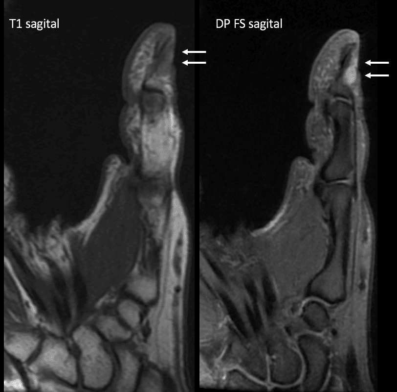 RM do primeiro quirodáctilo em plano sagital, sequências ponderadas em T1 e em densidade protônica com saturação de gordura.