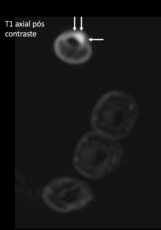 Observa-se intenso realce após a administração do meio de contraste venoso.