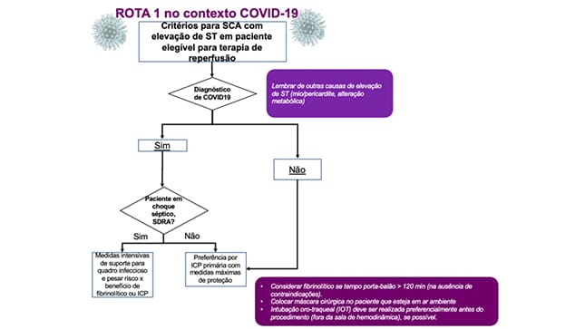 Finalmente, em casos excepcionais, caso haja alto grau de repercussão da infecção (por exemplo, choque séptico, SDRA) e o diagnóstico de síndrome coronariana aguda com elevação de ST seja estabelecido (situação incomum), a equipe médica deve avaliar o risco-benefício para definir a melhor estratégia terapêutica.