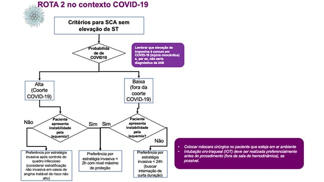 Nos pacientes com Covid-19 suspeita ou confirmada que apresentam síndrome coronariana aguda sem elevação de ST e não têm critérios de instabilidade, a opção habitual seria estratificar de forma invasiva o paciente após controle da infecção. Dessa forma, o manejo pode ser inicialmente conservador (medicamentoso e de suporte) sendo realizado de forma emergencial cateterismo se instabilidade pela isquemia (dor persistente, hipotensão, congestão pulmonar). Nos pacientes estáveis, o melhor momento do cateterismo depende do grau de repercussão infecciosa do paciente e do controle da isquemia causada pela síndrome coronariana aguda. Importante chamar a atenção para o fato de que a maioria das elevações de troponina em pacientes com infecção por SARS-CoV-2 (sigla do inglês, Severe Acute Respiratory Syndrome Coronavirus 2) são na verdade casos de injúria miocárdica, e o tratamento deve ser apenas o da doença de base (para fechar diagnóstico de IAM precisamos, além da curva de troponina, evidência de isquemia miocárdica, que deve ser buscada de forma ativa nestes casos).